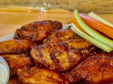 Slow Smoked wings. Then deep-fried for a crisp skin Available as BBQ, Hot, Sweet Chili or plain Tossed or sauce served on the side. Served with a side of Ranch or Blue cheese dressing.